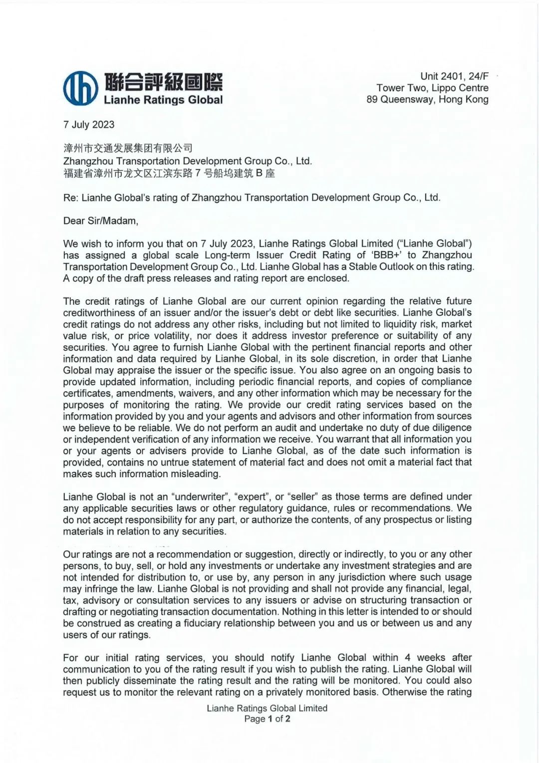 聯(lián)合評級是國際和國內(nèi)權(quán)威評級機(jī)構(gòu)之一,聯(lián)合國際資信授予漳州交通集團(tuán)BBB+級信用等級認(rèn)證和漳州交發(fā)建設(shè)集團(tuán)AA+評級,是對漳州交通集團(tuán)這些年發(fā)展成果做出的最客觀、最有說服力的評價。特別是給予漳州交發(fā)建設(shè)集團(tuán)評級AA+,意味著交發(fā)建設(shè)集團(tuán)具有的信用程度高、經(jīng)營狀況佳、具備發(fā)展?jié)摿?,也體現(xiàn)了資本市場對漳州交通集團(tuán)在國企改革和轉(zhuǎn)型發(fā)展過程中綜合實力和戰(zhàn)略布局的高度認(rèn)可,標(biāo)志著漳州市交通發(fā)展集團(tuán)有限公司資本運作能力邁上新臺階,為公司進(jìn)一步提升知名度、信譽(yù)度和提高議價能力、拓展融資渠道、優(yōu)化資本結(jié)構(gòu)、降低融資成本提供更加堅強(qiáng)有力的保障。