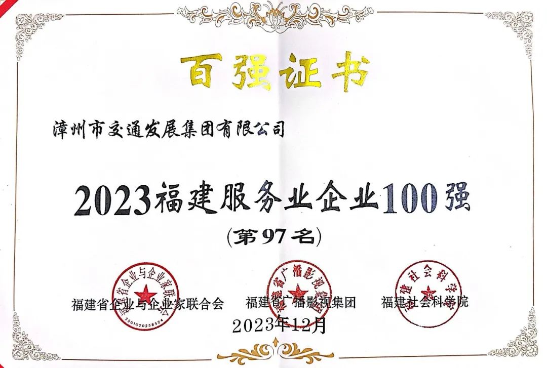 12月19日下午,2023福建企業(yè)100強(qiáng)發(fā)布大會(huì)在三明召開,漳州交通集團(tuán)榮登2023福建服務(wù)業(yè)企業(yè)100強(qiáng)。