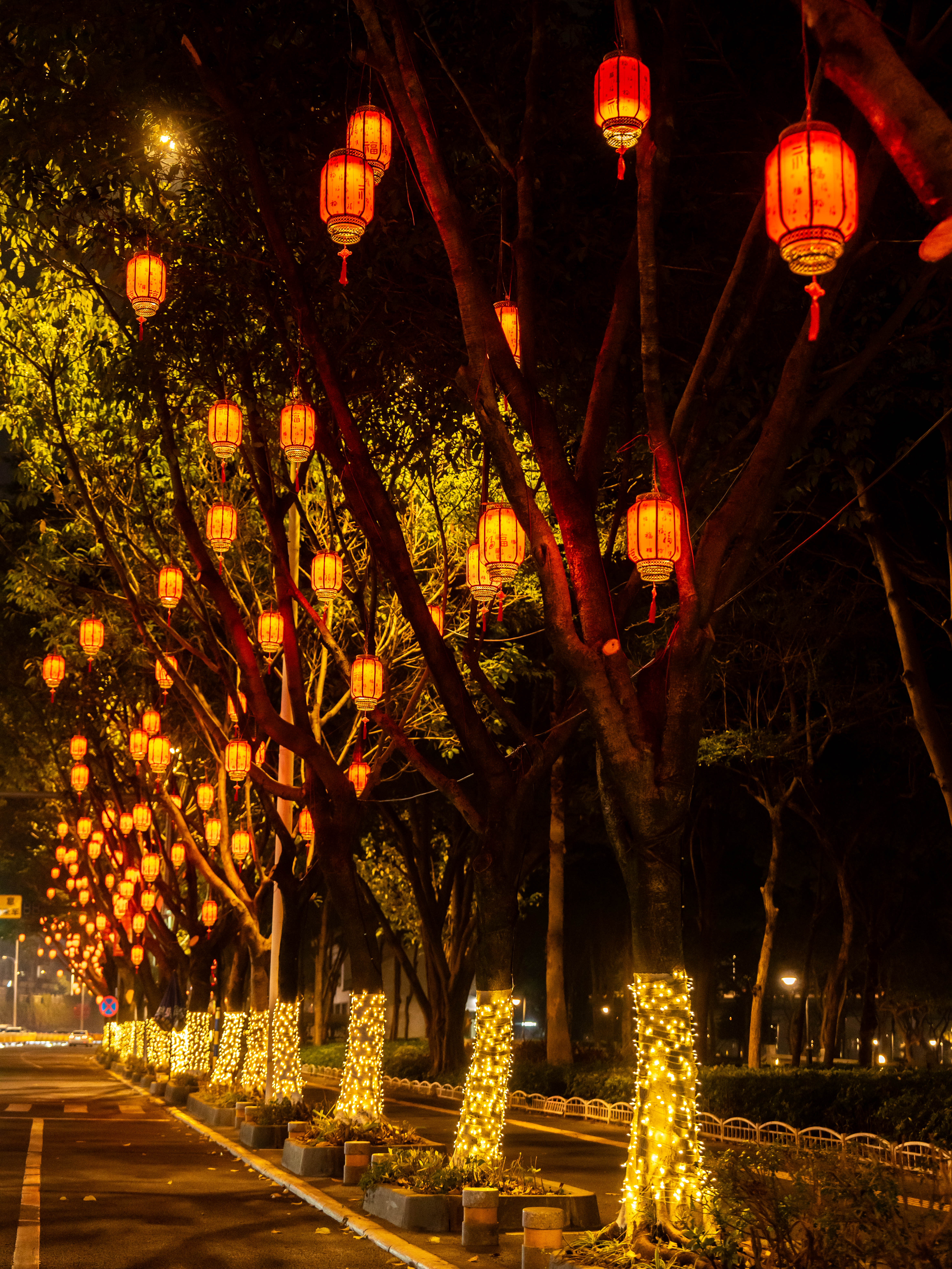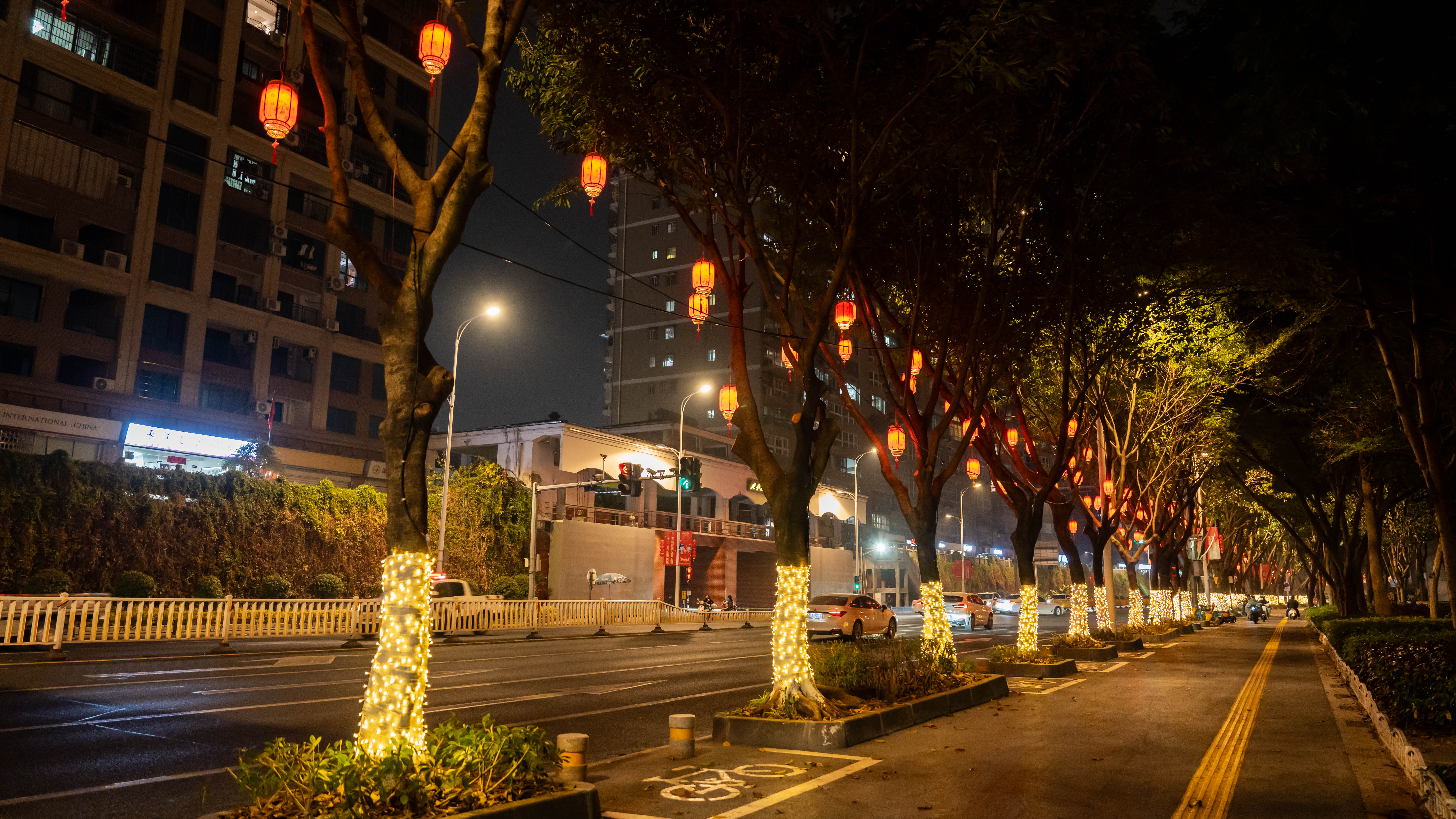 《鼓舞新春》(江濱路<戰(zhàn)備大橋-解放路閘門>)采用新中式燈籠結(jié)合滿天星樹(shù)燈,為江濱沿路的樹(shù)木披上光影華服,在技術(shù)賦能下構(gòu)筑了一條流動(dòng)的文化光譜,實(shí)現(xiàn)“一盞燈籠連接萬(wàn)家燈火”,不僅給這一條城市主干道增添了一抹靚麗的風(fēng)景,更表達(dá)了對(duì)全市人民的美好祝愿。