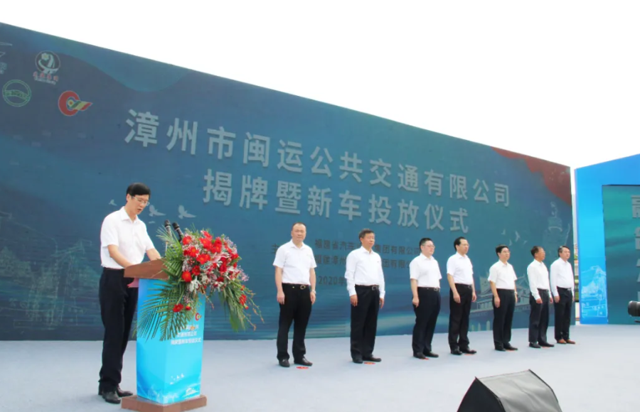 漳州市長(zhǎng)劉遠(yuǎn),福建港口集團(tuán)黨委書(shū)記、董事長(zhǎng)李興湖共同為漳州市閩運(yùn)公共交通有限公司揭牌。